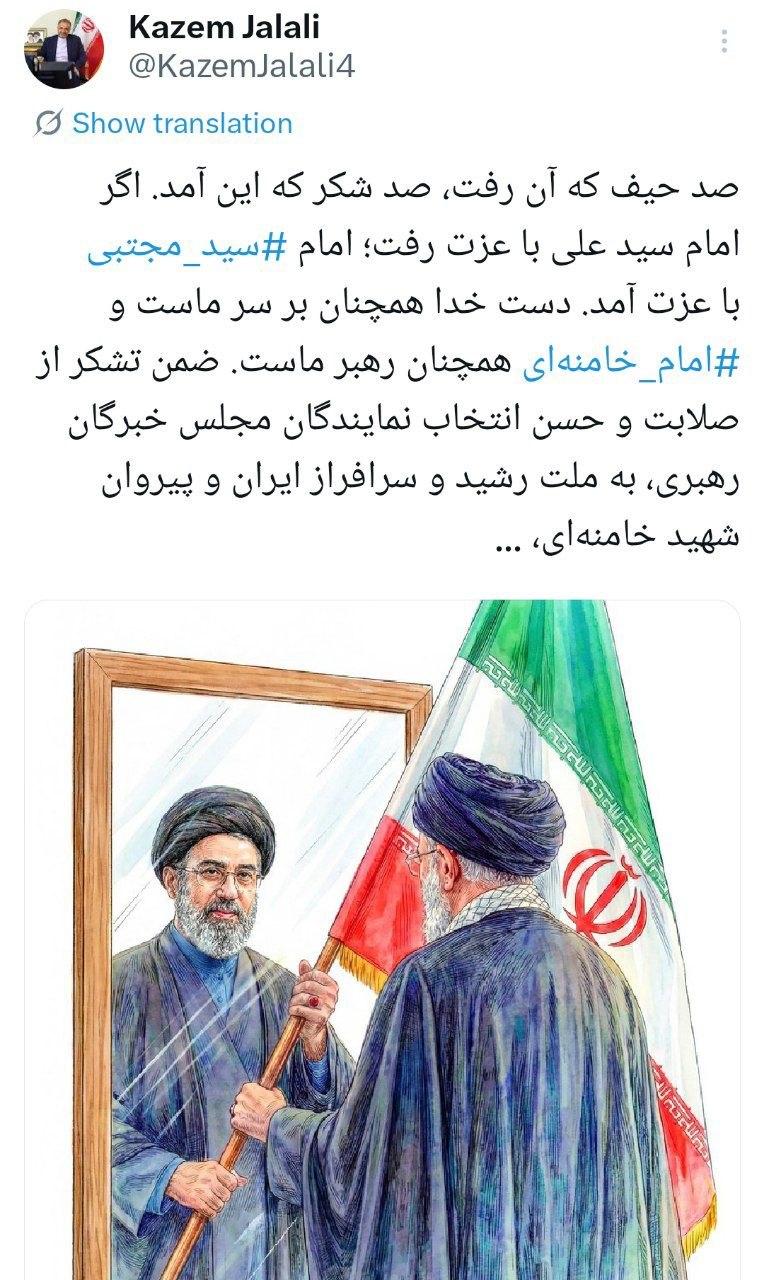 «صد حیف که آن رفت، صد شکر که این آمد. اگر امام سید علی با عزت رفت؛ امام سید مجتبی با عزت آمد. دست خدا همچنان بر سر ماست و امام خامنهای همچنان رهبر ماست. ضمن تشکر از صلابت و حسن انتخاب نمایندگان مجلس خبرگان رهبری، به ملت رشید و سرافراز ایران و پیروان شهید خامنهای، در سراسر جهان تبریک میگویم. بیعت استوار خویش را با رهبر معظم انقلاب اعلام میکنیم»